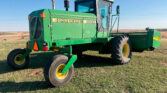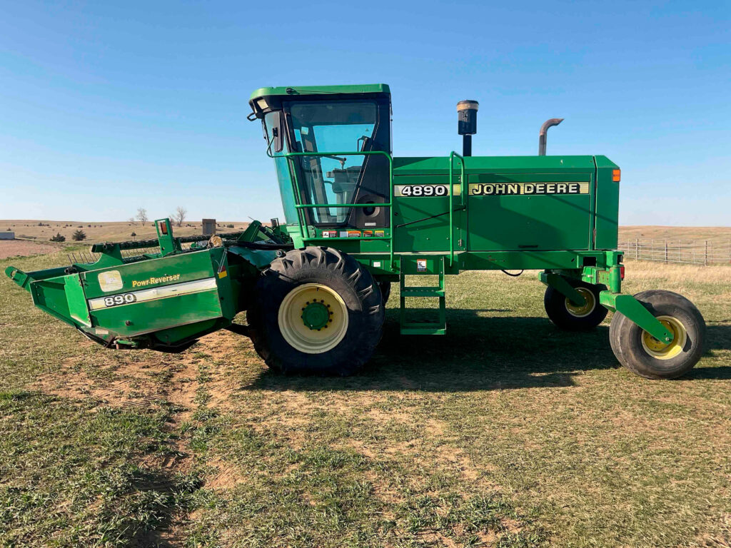 2001 John Deere 4890 Self-Propelled Windrower, John Deere 4.5L Turbo Diesel Engine, 2 Speed Hydrostatic Transmission, 4,040 Engine Hours, 3,080 Header Hours, John Deere 890 Power Reverser 16’ Sickle Head, Steel Crimper, Dual Auger Head, Head Skid Plates, Hydraulic Head Tilt, Adjustable Rear Axle, Carlisle 18.4-26 Drive Tires, Titan 14L-16.1 Rear Tires, Cab Heat, AC And Radio, Hydraulic Head Down Pressure, Cloth Operator And Buddy Seat, Operators Manual Included